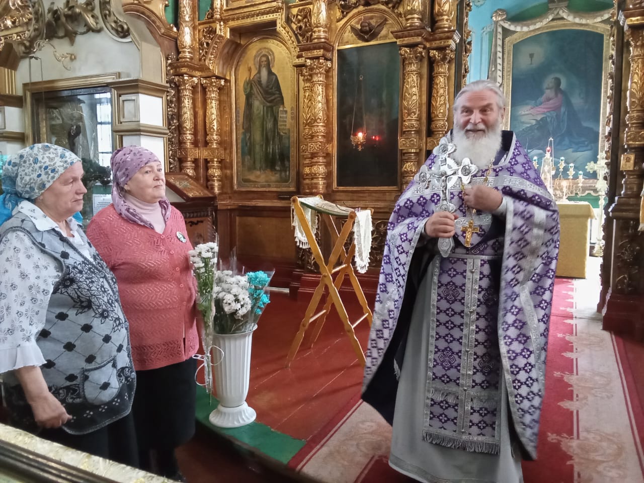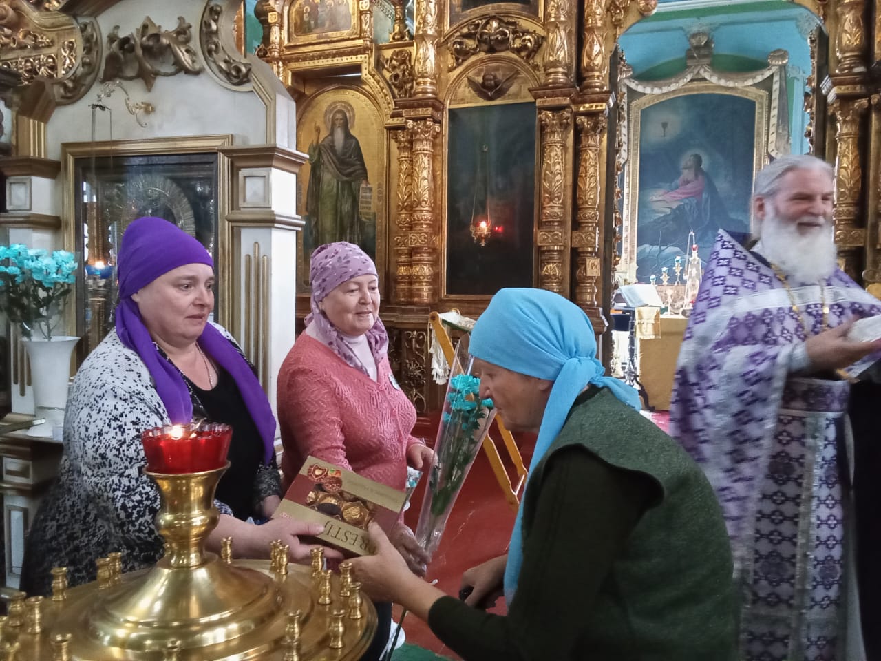 Отец Николай тепло поздравил с праздником всех прихожан, а именинницы получили в подарок букетик цветов (от благотворителя Олега Николаевича Логинова — «Долина роз») и коробку конфет (от Волонтерского центра Алексея Вихарева).