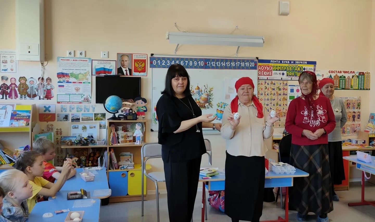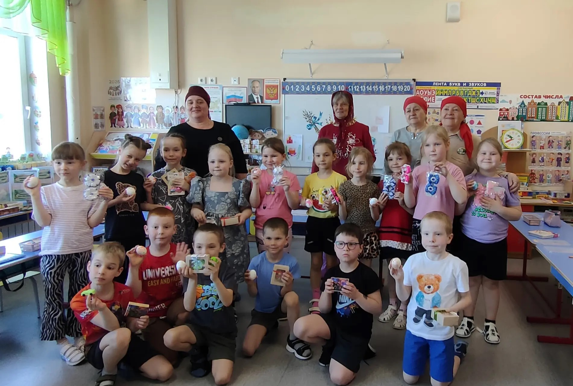 По окончании встречи сотрудники угостились пасхальными пирожными, а детки получили подарки в виде фигурок-игрушек и оригинальных бантиков для красивой девичьей прически. Эти гостинцы и пасхальные яйца, украшенные руками ребят, дети унесут домой, чтобы рассказать родителям о пасхальной радости и встрече с православными бабушками в красных пасхальных платочках.